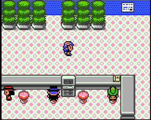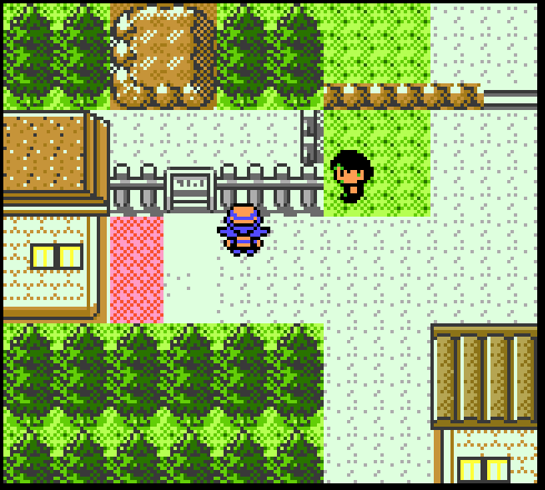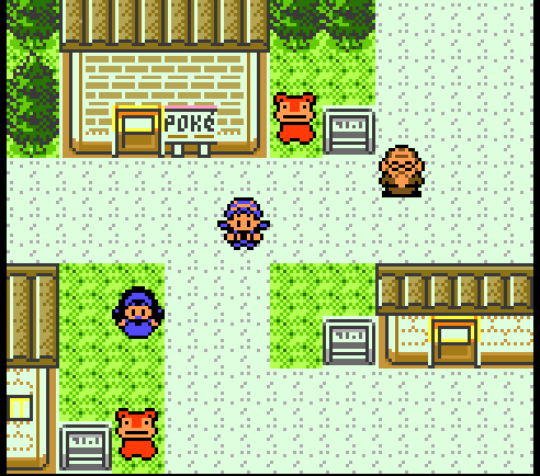 Most starting towns are small and have little going on in them and New Bark is no different. However, it still has some charm. The buildings are not arranged on a grid, which gives it a more organic feeling, as if this were a town that developed naturally without city planning. The small patches of grass that you can walk on break up the paved area, and the swaying flowers provide a nice nook to hide in. There is also the tantalizing promise of the water to the East. If this is your first Pokemon game, you may not be aware that you can even surf on that water! This gives you an incentive to come back later on when you've learned Surf.