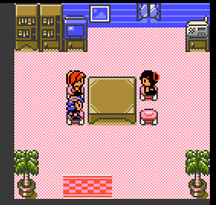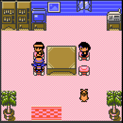 Here we see one of the two major styles of residential interiors in Johto. The standard modern style house has a micro checkerboard print, two palm trees (?), a TV, a map, a window, radio, two bookshelves, a center, stools. The rug also has a checkerboard pattern.