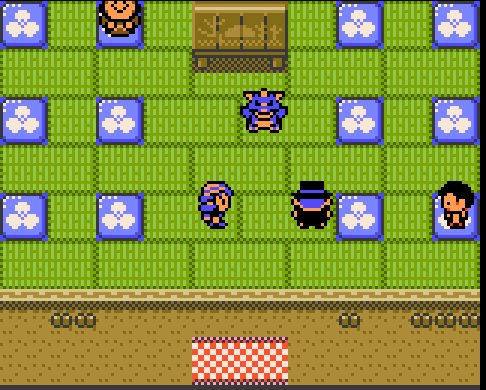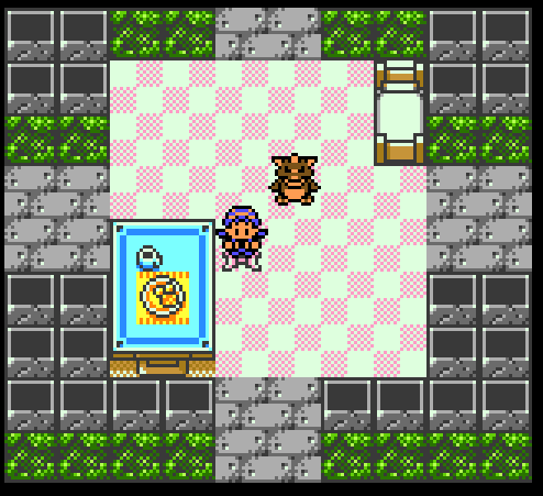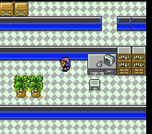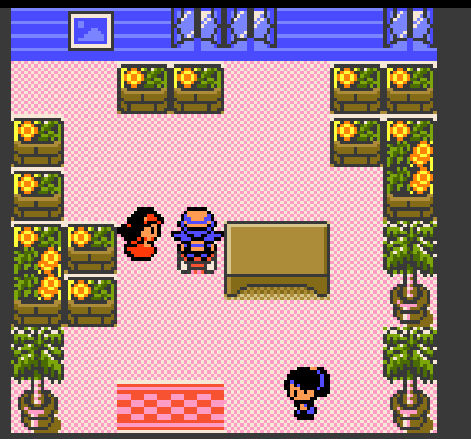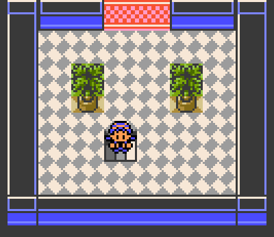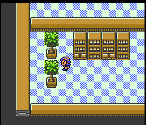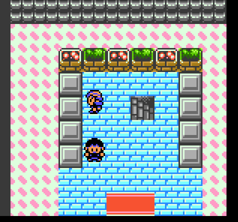 Goldenrod game corner has these plotted plants? And this curious big checkerboard tile. Different welcome mat as well, featuring a solid color with a pink border.
