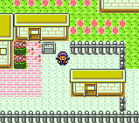 This is easily the most urban settlement in Johto, with not a scratch of grass to be seen except for by the florist's house. In addition, there is not just the common white paving, but actual red brick marking the common paths.