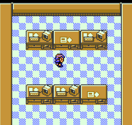 Earl's Pokemon Academy has seats, a lectern, and a green chalkboard. It also has a curious tesselating floor tile.